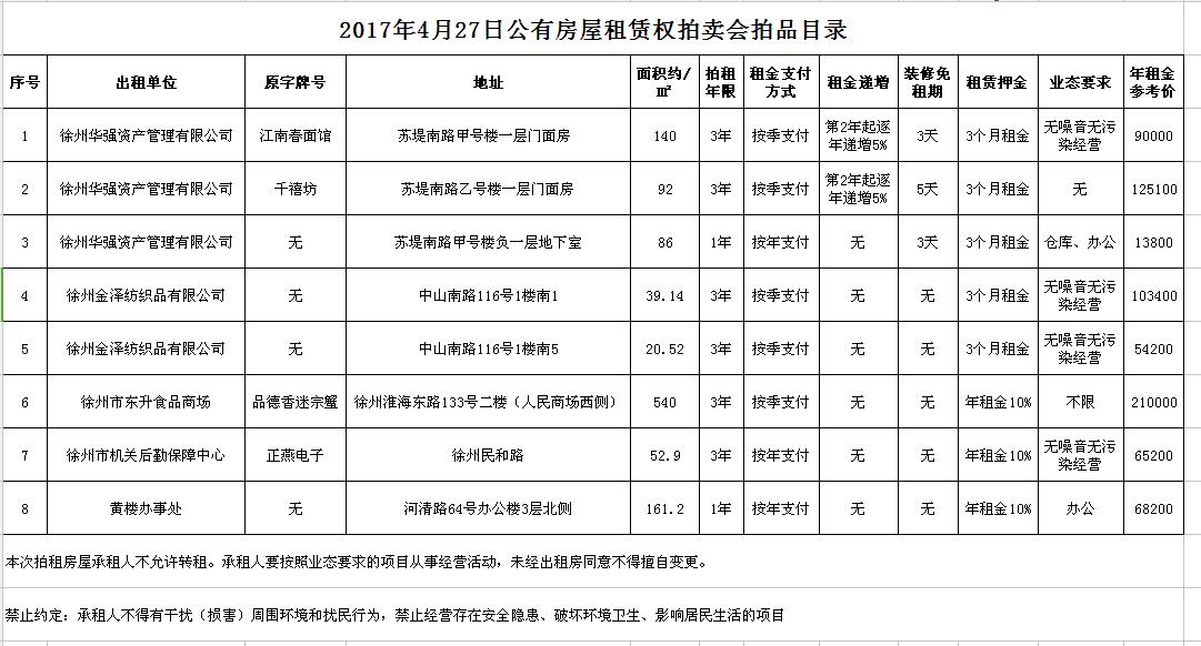 關注微信公眾號我公司受委托,定于2017年4月27日10時開始,通過中國拍賣行業(yè)協(xié)會網(wǎng)絡拍賣平臺(http://pm.caa123.org.cn),以網(wǎng)絡競價的方式公開拍賣公有房屋租賃權一批,租賃期限均為3年,以下房屋均為空房:
