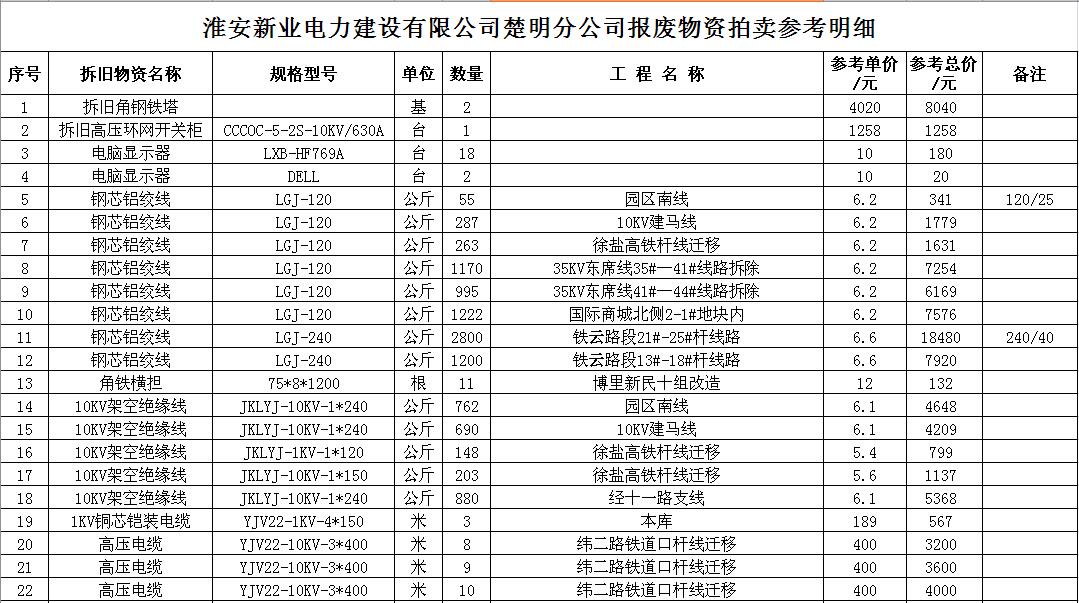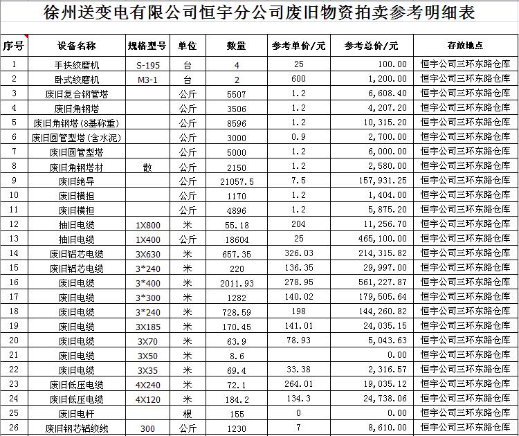 關(guān)注微信公眾號(hào)受江蘇徐供、淮供集體資產(chǎn)運(yùn)營(yíng)中心委托,我公司將通過(guò)中國(guó)拍賣行業(yè)協(xié)會(huì)網(wǎng)絡(luò)拍賣平臺(tái)以網(wǎng)絡(luò)競(jìng)價(jià)的方式公開拍賣以下單位的廢舊物資各一批: