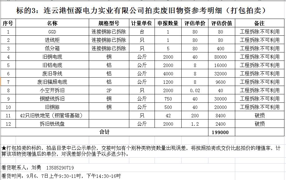 關(guān)注微信公眾號(hào)受連云港齊天實(shí)業(yè)有限公司委托,我公司將通過(guò)中國(guó)拍賣(mài)行業(yè)協(xié)會(huì)網(wǎng)絡(luò)拍賣(mài)平臺(tái)以網(wǎng)絡(luò)競(jìng)價(jià)的方式公開(kāi)拍賣(mài)以下單位廢舊物資: