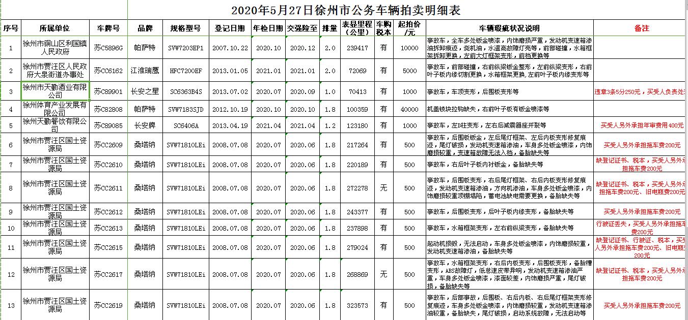 關(guān)注微信公眾號受委托,我公司定于2020年5月27日13:00時在徐州市銀地二手車交易市場四樓東南拍賣大廳通過現(xiàn)場和汽車街網(wǎng)絡拍賣平臺同步進行的方式公開拍賣以下公務車輛: