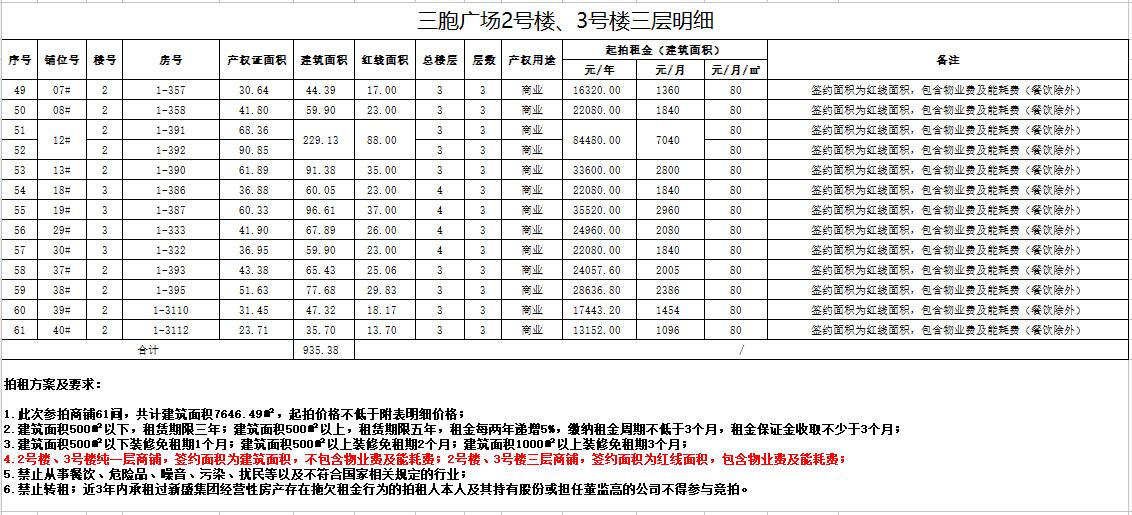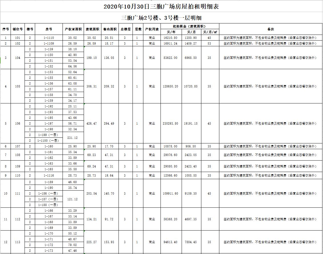 關注微信公眾號我公司受委托,定于2020年10月30日10時在徐州中山南路55號本公司三樓拍賣廳公開拍租:三胞廣場2號樓、3號樓1層、3層等部分商鋪及辦公房,面積分別約為數(shù)十至數(shù)百平米,租期3-5年。禁止從事危險品、有污染及擾民的行業(yè)經(jīng)營。