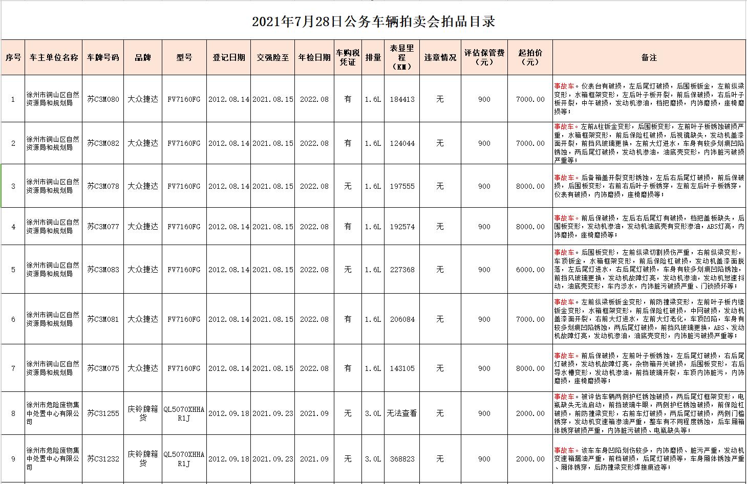 7月26日、27日在徐州銀地二手車交易市場(chǎng)展示。有意競(jìng)買者請(qǐng)持有效證件到我公司辦理報(bào)名手續(xù),并交納每輛車1萬(wàn)元保證金即可參拍,報(bào)名截止至7月27日16時(shí)。