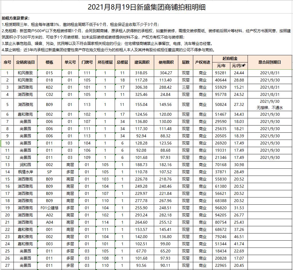 關(guān)注微信公眾號(hào)我公司受委托,定于2021年8月19日10時(shí)在徐州市中山南路55號(hào)本公司拍賣廳公開拍租以下商鋪:湖西雅苑10間、嘉和雅苑4間、尚景園13間、玉潭佳苑3間、康馨園3間、楓情水岸1間、潤(rùn)和園1間、天瑞華府1間、和風(fēng)雅致2間。面積分別約為數(shù)十至三百余平米不等,租期均為三年。